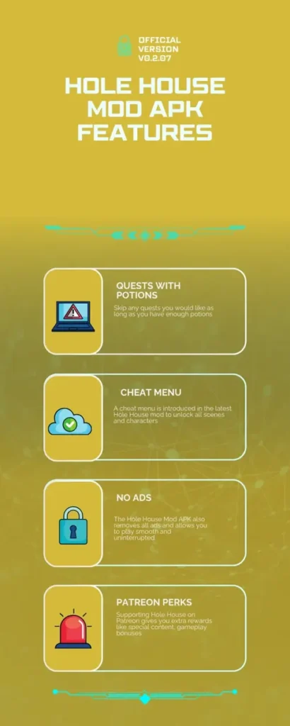 The Hole House APK Mod lets you enjoy the Game without limits. You get access to all images, animations, and extra content for free, and there are no ads, so it’s smooth to play. You can also skip and quest in the Mod version. Mod APKs are made by third-party developers to unlock paid features without spending money. That’s why they’ve become very popular.